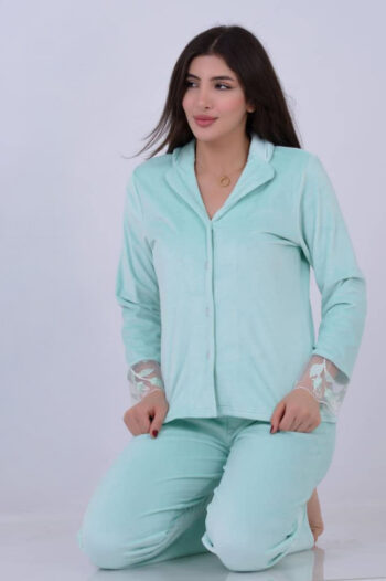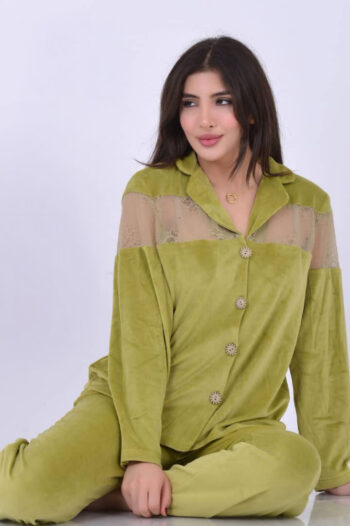 بيجامة مخملية ناعمة بأزرار أمامية وتفاصيل دانتيل رقيقة على الأكمام.