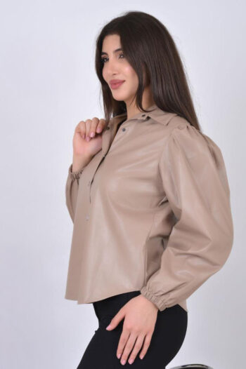 قميص أنيق من الجلد الصناعي، تصميم عصري بأكمام منفوشة لمظهر جريء ومميز.
