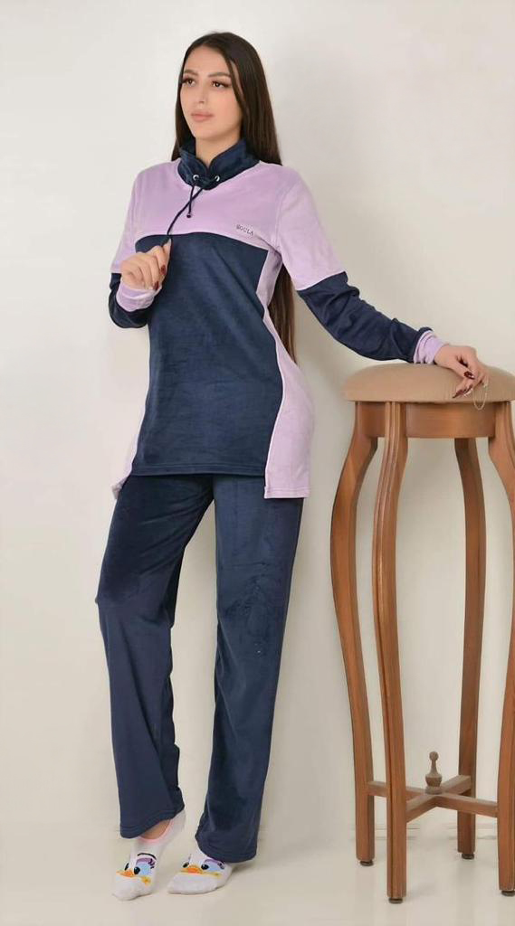 استمتعي بالدفء والأناقة في آنٍ واحد مع هذه البيجامة المخملية الطويلة. تتميز بتصميم أنثوي عصري يجمع بين لونين متناغمين مع ياقة مرتفعة برباط لإطلالة عملية ومريحة، بالإضافة إلى بنطال طويل بقصة انسيابية. خيار مثالي للشتاء والجلوس بالمنزل براحة وأناقة.