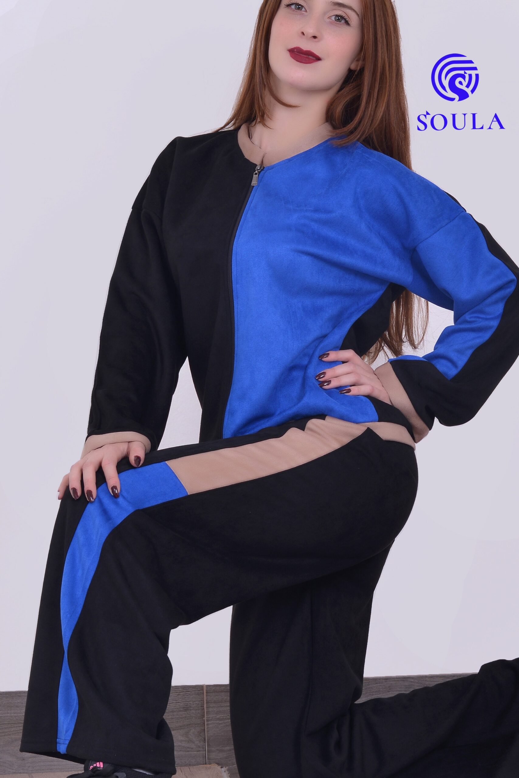 بيجاما أنيقة من خامة ريب، بتصميم سحاب أمامي كامل وياقة عالية لمظهر عصري وراحة مثالية.