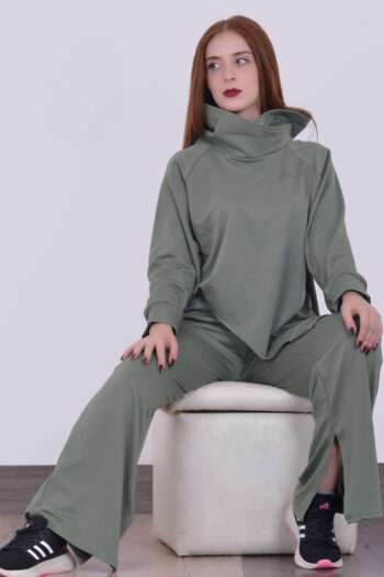 طقم رياضي شتوي من قطعتين بقصة واسعة مريحة، جاكيت بسحاب وياقة بولو ناعمة مع بنطال واسع مناسب للبيت والخروج الكاجوال.