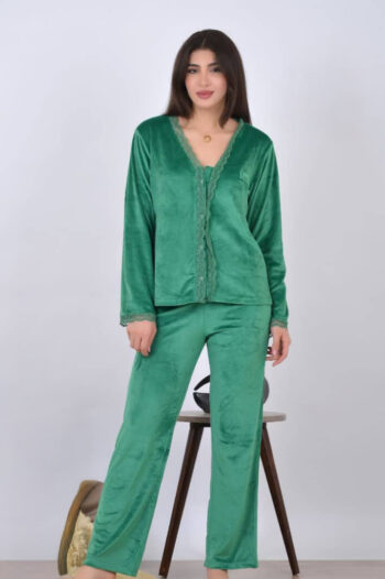 طقم بيجاما ناعم بخامة مخمل دافئة وتطريز أنثوي لطيف، مناسب للراحة اليومية خلال الشتاء.